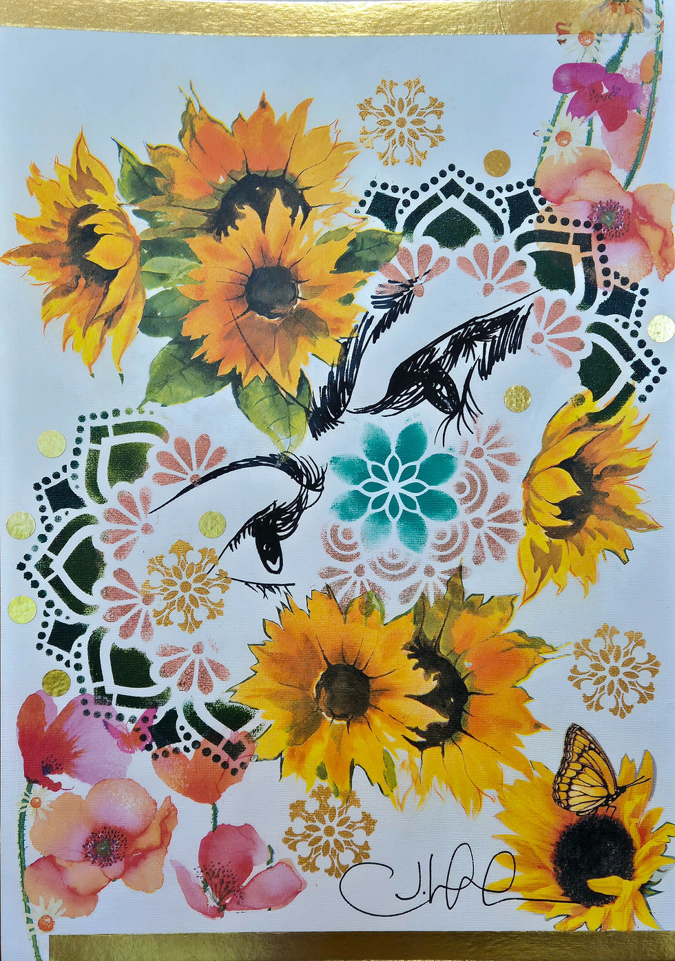 Obras de arte de técnica mista – stencil, colagens, carimbos etc. de forma a oferecer uma experiência mais acessível de arte como espelho arte e cura.